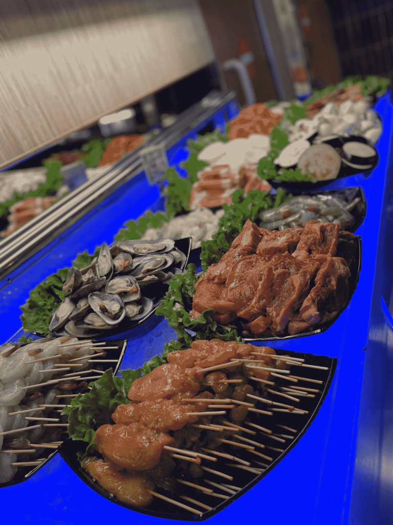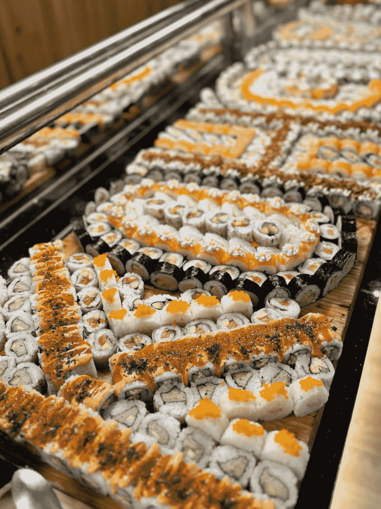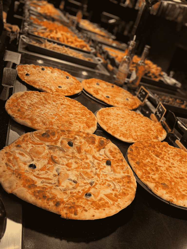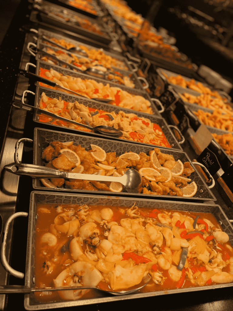 Notre restaurant propose un buffet de différentes spécialités : asiatique (sushis, makis, nouilles sautées, nems, pad thaï, poulet curry…), européenne (gratin, pizza, fromage, charcuterie) et bien sûr un bar à salade, des woks et des grillades à composer par vous même. Notre variété de desserts (glaces, verrines sucrées…) et des fruits vous régaleront également à la fin de votre repas.